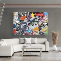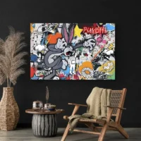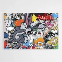 Ce Tableau Pop Art Bugs Bunny montre le célèbre lapin en gros plan, avec le visage gris et blanc, les longues oreilles dressées dont l’intérieur rose ressort bien, et les deux incisives visibles qui cassent l’air sérieux. Les contours noirs marqués soulignent les traits. Le fond présente des aplats de couleur vifs et contrastés, avec une impression de sérigraphie et des touches graphiques nettes qui attirent le regard.