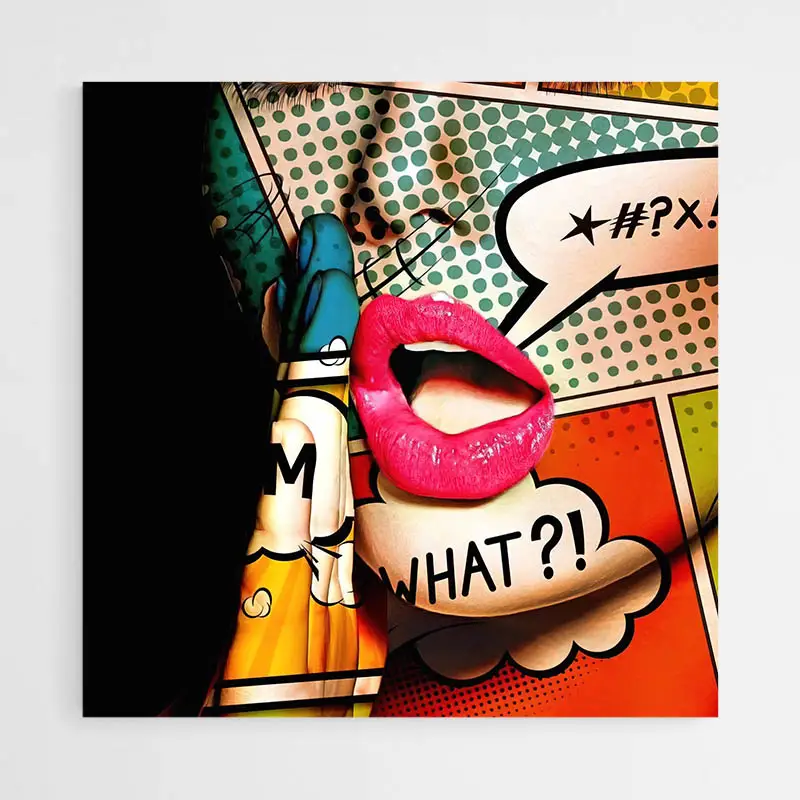 Ce Tableau Pop Art Coloré attire l’œil avec des aplats de couleurs franches: rose fuchsia, jaune canari, bleu électrique et vert menthe. On voit un visage stylisé en gros plan, des traits noirs marqués, des lèvres bien dessinées et un œil mis en valeur par des points de trame. Le fond joue avec des zones unies et des motifs de points ronds, qui apportent du rythme. Les contours restent nets, presque dessinés à la main, et la composition reste très graphique.