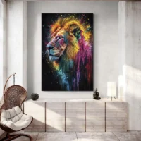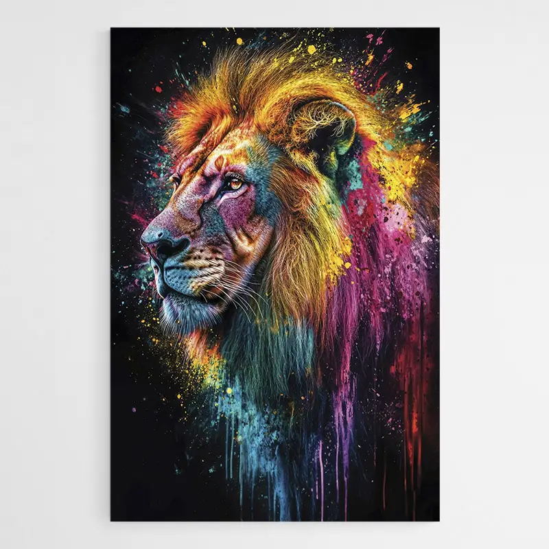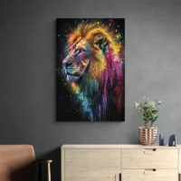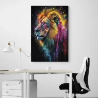 Sur un mur clair les couleurs s’illuminent, sur un mur sombre l’ambiance devient plus intense. Associez-le à des cadres noirs fins ou à d’autres œuvres colorées pour un mur cohérent. Idéal aussi dans un bureau ou une entrée. Pour étoffer la déco, regardez nos sélections tableaux lion et tableaux pop art.