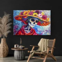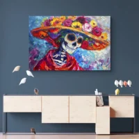 Le style pop art se lit dans les couleurs franches, les contours nets et les formes graphiques. On ressent de l’énergie, de la malice, une présence qui capte la pièce. Ce tableau plaira à qui aime les images fortes, l’esthétique mexicaine et les pièces qui attirent le regard.