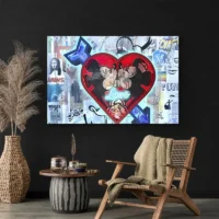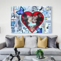 Ce Tableau Pop Art Mickey Minnie montre Mickey et Minnie en gros plan, l’un à côté de l’autre, avec des contours noirs très marqués. On voit clairement les grandes oreilles rondes de Mickey, le nœud de Minnie orné de pois blancs, et des demi-teintes en points qui rappellent la bande dessinée. Le rendu joue sur des aplats de couleurs vives et des zones unies, le trait reste net, presque graphique.
