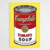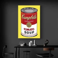Ce Tableau Pop Art Soupe Campbell Rouge montre en gros plan une boîte de soupe Campbell, posée sur un fond rouge vif. On voit l'étiquette blanche avec l'inscription Campbell's, le couvercle doré et un reflet métallique sur le dessus. On remarque aussi un léger halo autour de la boîte qui accentue le contraste. Les contours noirs et le contraste fort rendent l'image nette, presque graphique.
