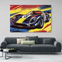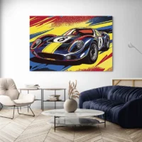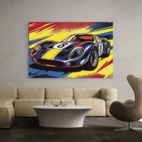 Le rendu évoque le pop art: aplats, contours marqués et motifs qui accrochent le regard. On imagine que les passionnés de voitures de sport vont l'aimer, que les amateurs de déco graphique vont en profiter et que ceux qui aiment les images dynamiques vont s'y retrouver. L'effet recherché, donner du rythme au mur et créer une note colorée, fonctionne bien. On sourit, on regarde, on revient.