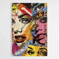 Ce Tableau Pop Culture Femmes montre des portraits féminins stylisés, en gros plans. On voit des aplats de couleurs vives: rose fuchsia, jaune et bleu. Les contours sont nets, presque graphiques, et les traits du visage restent simples. Une des femmes porte des lunettes rondes noires, une autre a des lèvres rouge vif, on distingue aussi un motif de points qui rappelle la bande dessinée. L'ambiance reste vive, énergique, et un peu rétro.