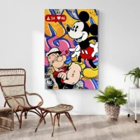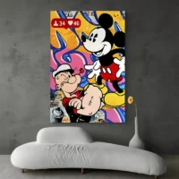 Ce Tableau Popeye Pop Art montre le visage de Popeye en gros plan, avec sa pipe bien visible, l’œil plissé caractéristique et la casquette de marin. On voit des contours noirs marqués qui découpent le dessin. La toile utilise des aplats de couleurs vives et des points de trame apparents, typiques du pop art. L’expression reste déterminée, presque amusée, et ça accroche tout de suite.