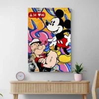 On reconnaît le style pop art: contraste fort, traits nets, répétition de motifs et textures. Ce tableau plaira aux amateurs de bande dessinée, aux fans de l’univers marin et à ceux qui aiment une touche colorée et graphique. Il donne un effet dynamique, joyeux, un peu clinquant parfois, qui réveille un mur.