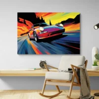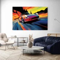 La composition met en avant la silhouette sportive et la sensation de mouvement. Ce tableau séduira les passionnés d'automobile, les collectionneurs et ceux qui veulent un mur avec du caractère. L'ambiance reste dynamique, élégante et un peu brute, idéale pour un espace de travail ou un atelier.