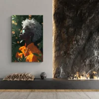 On ressent une force tranquille. On aime le contraste clair des cheveux blancs et la profondeur du teint. Les lignes du cou et des épaules donnent du rythme, les couleurs restent limitées, simples. Le traitement reste très graphique, net, et met en valeur la silhouette du visage. Ce tableau conviendra à qui cherche une pièce forte, sobre et qui attire le regard sans en faire trop.