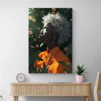 Ce Tableau portrait femme noire cheveux blancs attire le regard. On voit un visage en plan rapproché, une peau foncée contrastant avec des cheveux blancs bien visibles. Le cadrage se concentre sur le buste et le visage, les traits restent nets, l’expression paraît calme, posée. Le rendu reste épuré, les contours restent précis, sans surcharge.