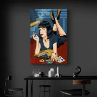 Tableau Pulp Fiction Pop Art frappe par son traitement graphique. On voit un visage inspiré du film, cheveux noirs coupés au carré, lèvres rouge vif et un regard fixe. Le fond propose des aplats de jaune et de rouge qui contrastent avec des ombres profondes. Les contours noirs sont nets, et la trame de points rappelle les impressions des affiches. On sent tout de suite l’énergie, l’image retient le regard.