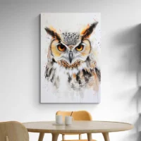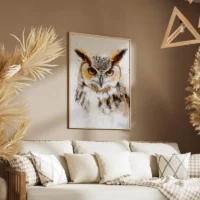 Ce Tableau Scandinave Chouette montre une chouette stylisée en gros plan sur un fond clair. On voit des yeux ronds bien marqués, un petit bec triangulaire et un plumage en motifs géométriques. La palette reste douce, avec des tons beige, gris et marron qui rendent le rendu apaisant.
