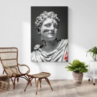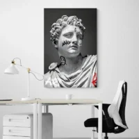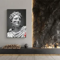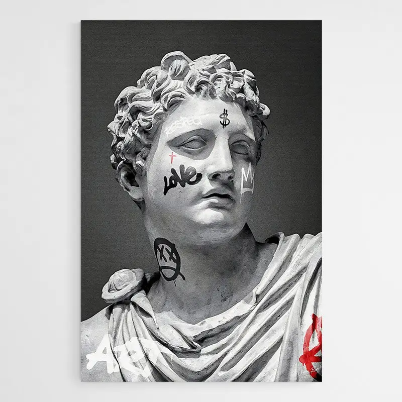 Ce Tableau Sculpture Urbaine montre une sculpture en gros plan devant un décor urbain flou. On voit un visage sculpté aux traits anguleux, une matière claire qui rappelle la pierre, des fissures visibles et des stries sur la surface. Le fond présente des immeubles flous, des touches de peinture orange sur un mur et un ciel pâle. L’éclairage latéral crée des ombres marquées, le profil regarde vers la droite, les bords restent très rugueux.