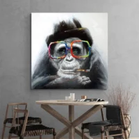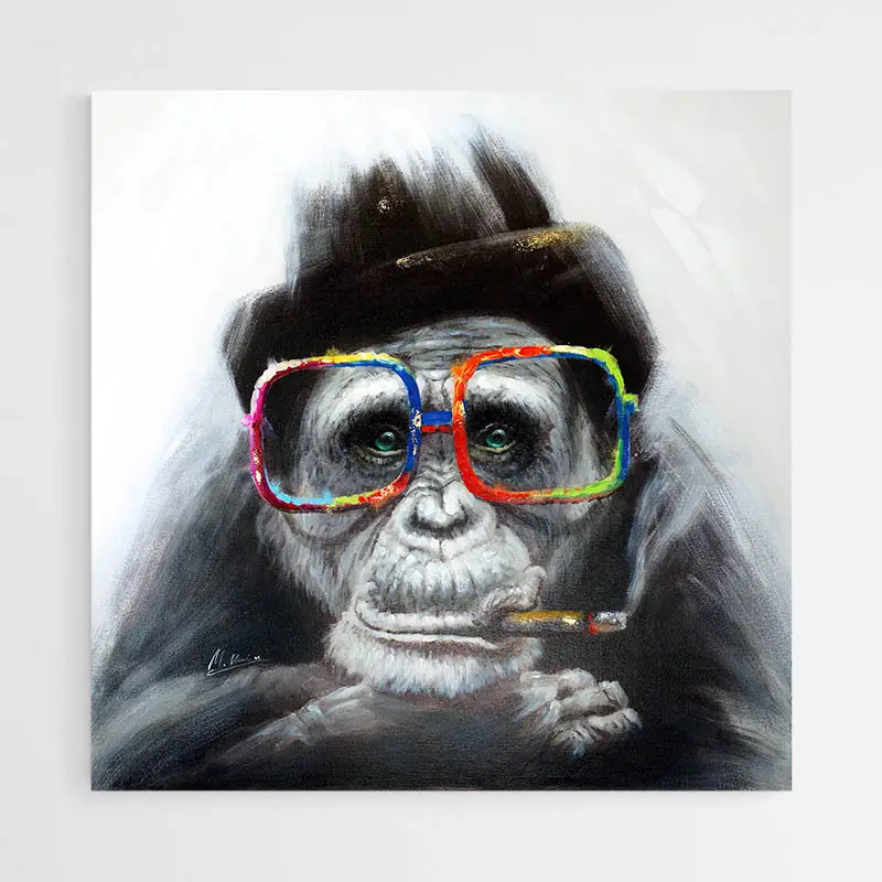 Ce tableau attire le regard avec un singe en gros plan, sourire espiègle et lunettes noires. Le fond clair et la fourrure chaude donnent une impression lumineuse sur le mur. On ressent une énergie légère et joyeuse.