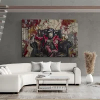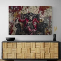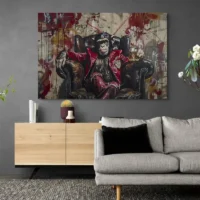 On l'accroche au-dessus d'un meuble en bois foncé, le tableau crée un contraste chaleureux. Associez-le à des objets en métal ou en verre pour rappeler le verre de whisky, ou à une autre pièce singe pour un mur thématique. Pour une ambiance moderne, regardez aussi nos tableau singe ou nos tableaux modernes.