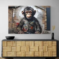 Ce Tableau Singe Street Art montre un singe en gros plan, le visage centré, les yeux bien marqués et la bouche visible. On distingue des traits noirs qui soulignent les contours, des éclaboussures de peinture autour du museau et un fond qui évoque un mur urbain texturé. Le rendu reste brut, très graphique, direct. On aperçoit aussi des lignes blanches qui rehaussent certains traits. On aime ce mélange rugueux et coloré, on aime le contraste.