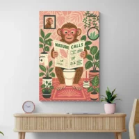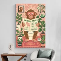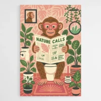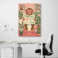 Ce visuel parle aux personnes qui aiment l’humour discret. L’expression du singe apporte du caractère. Les couleurs se limitent au brun du pelage, au blanc de la toilette et à un arrière-plan pâle. Le rendu reste simple et direct, sans surcharge. Il convient aussi bien pour des toilettes que pour une salle de bains, ou pour un coin détente où l’on veut surprendre les invités.
