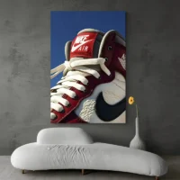 Ce Tableau Sneakers Nike Jordan montre en gros plan une paire de Jordan 1 à la silhouette haute. On voit des zones de couleurs nettes: rouge vif, blanc cassé et noir profond. Le Swoosh apparaît clairement sur le flanc. La semelle blanche contraste avec la tige colorée. On distingue les oeillets, les surpiqûres et la texture du cuir. Le rendu reste très net, précis, presque photographique.