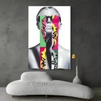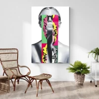 Ce Tableau Street Art Andy Warhol montre un portrait stylisé, très graphique et immédiatement lisible. On voit un visage traité en aplats de couleurs vives: jaune, rose et bleu. Des contours noirs marquent les traits. On distingue aussi des touches de peinture éclaboussée et un effet pochoir, avec une texture qui rappelle la bombe. L'image reste nette, contrastée, presque rugueuse, elle accroche le regard.