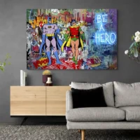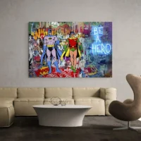 Ce tableau mise sur l'énergie du street art. Il parle aux fans de super-héros et aux amateurs de bande dessinée. L'effet recherché : un mur qui claque, qui attire le regard et qui rappelle la rue et l'action. On sent la vitalité et le côté graphique.