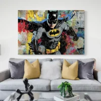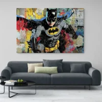 Ce Tableau Street Art Batman montre un visage masqué, traits anguleux et regard intense. Le costume apparaît en aplats sombres, avec des zones de noir et de gris, ombres marquées. Le fond propose une texture murale, taches de peinture, éclaboussures et coulures, comme un mur de rue. On distingue aussi des touches de blanc qui soulignent le contour du masque.