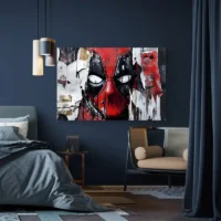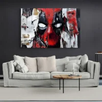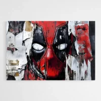 Le Tableau Street Art Deadpool frappe par sa palette simple et contrastée: un masque rouge vif, des zones noires autour des yeux et des aplats blancs pour les pupilles. On distingue des éclaboussures de peinture, des traits de spray et un fond gris texturé qui rappelle un mur en béton. Les contours épais du visage et les taches noires apportent un côté brut. On ressent une énergie directe, un ton malicieux et un clin d'œil au monde des héros masqués.