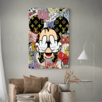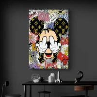 Ce Tableau street art Disney affiche un grand visage stylisé inspiré de l’univers Disney. On voit des contours noirs très marqués, des coulures de peinture qui descendent, et des éclaboussures rouges, jaunes et bleues sur un fond plutôt clair. Les yeux ronds ressortent sous des traits épais. L’expression semble souriante, énergique, presque espiègle. Des aplats de couleur créent du contraste. On ressent tout de suite l’ambiance de rue, brute et colorée.