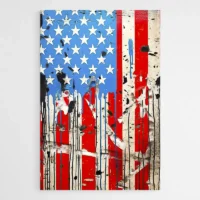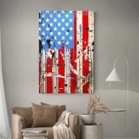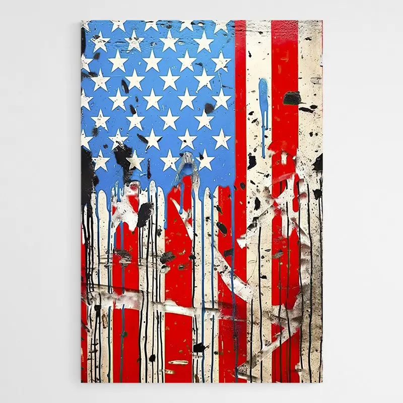 Ce Tableau Street Art Drapeau Americain montre un drapeau américain réinterprété façon rue. On voit les étoiles blanches sur le canton bleu, les bandes rouges et blanches bien marquées, de grandes éclaboussures et des coulures de peinture qui descendent. Des traits noirs et des touches de blanc ajoutent du relief. L'ensemble garde un aspect rugueux, comme peint sur un mur, avec des bords irréguliers qui rendent la composition vivante.