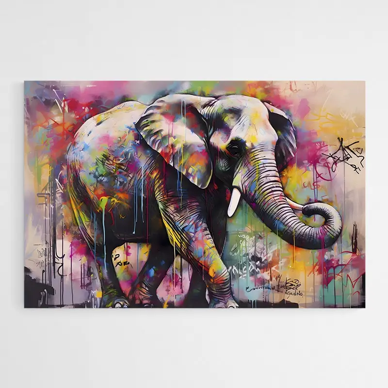 On ressent une ambiance de rue: peinture en bombe, couches superposées et contrastes francs. Le rendu plaira aux amateurs d'images fortes et aux fans d'animaux stylisés. L'éléphant, sérieux mais expressif, apporte à la pièce une présence douce et puissante à la fois. On cherche l'impact visuel, un point d'attention sur le mur.