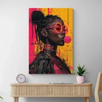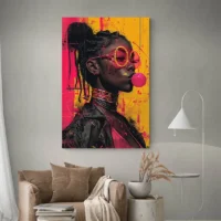 Tableau street art femme noire avec chewing gum, une touche urbaine et colorée