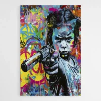 Ce Tableau Street Art Petite Fille montre une fillette en gros plan, avec un rendu pochoir. On voit des contours noirs précis, un fond urbain texturé et des éclaboussures de couleur qui donnent du mouvement. Le visage reste simple, le regard de côté, les joues légèrement rosées, les cheveux libres qui tombent sur l’épaule. On retrouve aussi des traits énergiques et des zones de peinture qui se superposent, un contraste marqué entre le sujet et l’arrière-plan.