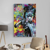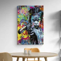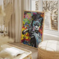 Accrochez cette toile sur un mur brut ou clair pour que les couleurs ressortent. Associez-la à des cadres sobres et quelques plantes vertes pour adoucir l’ensemble. Pour compléter le mur, pensez à nos tableaux street art ou à des pièces plus vives comme nos tableaux pop art.