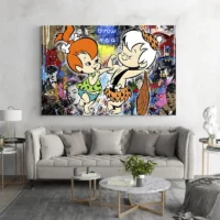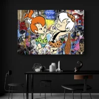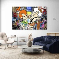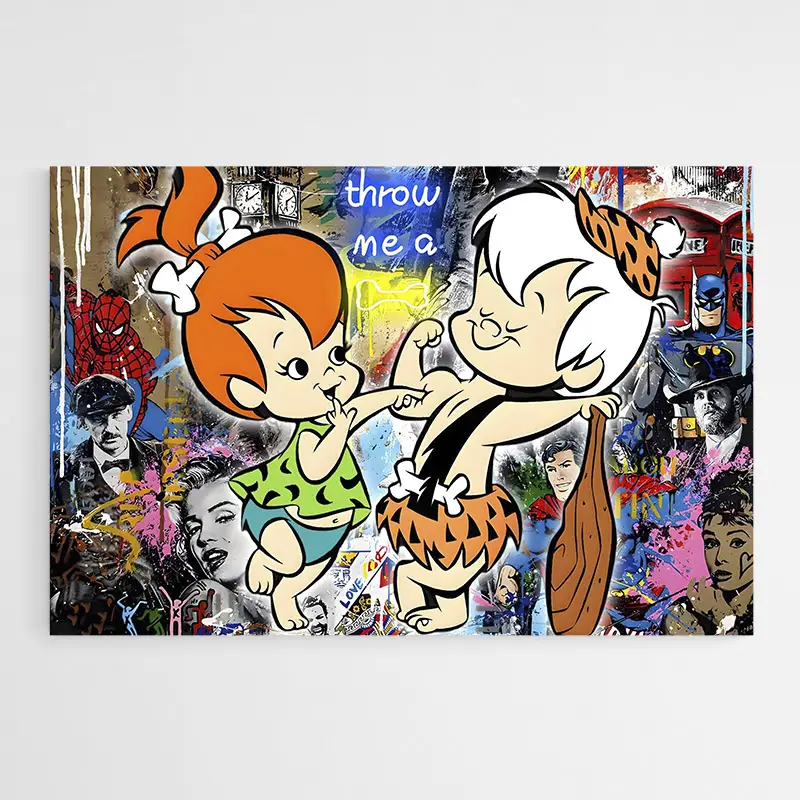 Le rendu rappelle le pochoir et le spray, avec des aplats de couleur vifs et des ombres simplifiées. On ressent une ambiance urbaine, joyeuse et légèrement provocante. Ce tableau plaira aux fans de personnages dessinés, à ceux qui aiment la couleur et le trait franc.