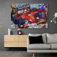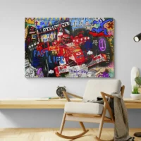 Accrochez cette toile au dessus d’un meuble bas, sur un mur blanc ou béton, pour laisser respirer les couleurs. Associez-la à des accessoires métal, des photos noir et blanc, ou d'autres affiches urbaines pour un mur cohérent. Pour explorer des options proches, découvrez nos tableaux street art ou nos tableaux voiture.