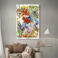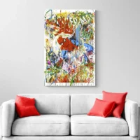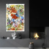 Les contrastes entre le rouge et le bleu attirent le regard. Les yeux blancs, les lignes noires et les petites gouttes de peinture donnent du mouvement. Ce visuel plaira aux amateurs de bandes dessinées, aux fans de super-héros, et à ceux qui cherchent une déco urbaine et affirmée. On regarde, on sourit, on revient.