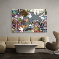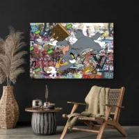 Le style rappelle le pochoir et la bombe sur mur, avec des contours noirs, des aplats et des zones usées. On ressent de l'énergie, de la malice, un côté espiègle. Ce tableau plaira aux fans de Tom et Jerry, aux amateurs de street art et à ceux qui cherchent une affiche dynamique pour une pièce jeune ou décalée.
