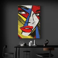 Le Tableau Style Roy Lichtenstein frappe par son visage féminin en gros plan, ses traits noirs épais et ses points de trame bien visibles. On voit des lèvres rouges, un œil stylisé avec un trait noir, et une chevelure aux aplats de couleur jaune et bleu. Le fond reste clair, presque blanc, ce qui renforce le contraste. Cette toile apporte immédiatement une touche vive et nette.