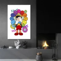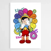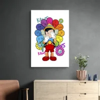 Ce Tableau Takashi Murakami Kaws frappe par son contraste. On voit un personnage au corps sombre, des yeux en croix bien marqués et des mains arrondies. Autour, des fleurs souriantes multicolores envahissent l’espace: jaunes, roses, bleues. Les contours noirs et épais donnent un rendu net, presque cartoon. L’ensemble reste clair, lumineux, très visuel.