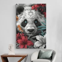 Ce Tableau tête de panda attire le regard avec un gros plan simple et net. On voit la tête blanche du panda, les taches noires autour des yeux, les oreilles rondes et foncées. Le nez noir, petit, apparaît au centre et le regard paraît calme, presque sérieux. Le fond reste blanc et pur, sans motif, ce qui met le sujet en valeur. Des ombres douces soulignent les contours.