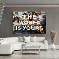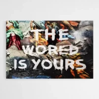 Ce Tableau The World Is Yours montre un globe terrestre en gros plan et le texte THE WORLD IS YOURS en lettres capitales. Le fond reste sombre, proche du noir, et le globe présente des continents bien dessinés. On voit un fort contraste entre le texte et l'image, des zones claires autour des côtes et une impression légèrement granuleuse qui ajoute du relief. Le rendu reste sobre, marqué et facile à lire de loin.