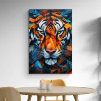 Ce Tableau tigre cubisme montre une tête de tigre en gros plan. On voit des formes anguleuses superposées, des rayures noires marquées et des zones de couleur orange et crème. Les yeux attirent immédiatement le regard, ils donnent du caractère. Le fond reste clair et discret, il laisse la composition respirer.