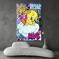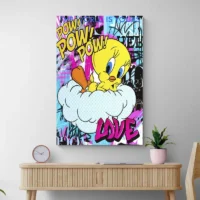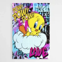 Ce Tableau Titi Pop Art montre Titi en gros plan, plumage jaune vif et silhouette ronde. Le visage affiche de grands yeux ronds contrastés par des contours noirs, et un petit bec orange visible. Le traitement pop art apparaît avec des aplats de couleur: un fond rose et un carré bleu, des traits épais et des points qui donnent une texture graphique.