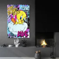 Sur un mur blanc, les couleurs ressortent fortement. Sur un mur clair ou beige, l'image garde sa chaleur. Idéal au-dessus d'un canapé bas ou d'une étagère. Associez-la à d'autres tableaux pop art ou à des pièces plus neutres comme des tableaux d'animaux pour un contraste réussi.