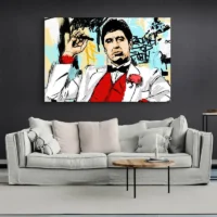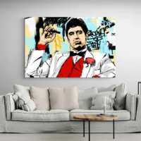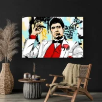 Ce Tableau Tony Montana montre un visage en gros plan, un regard fixé droit devant, des traits marqués et des ombres nettes. Le fond reste sombre, avec des touches rouges qui donnent du relief. Les yeux paraissent déterminés, la bouche fermée. Des aplats très contrastés rendent la carnation. On voit des lignes graphiques autour du visage, et une présence presque théâtrale, très puissante, très directe.
