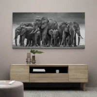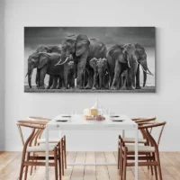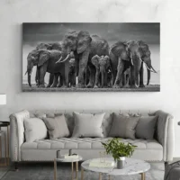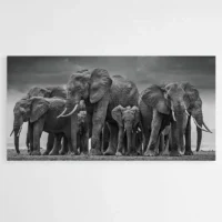 Ce style parle à ceux qui aiment la nature et les ambiances calmes. On ressent une émotion de stabilité et de sagesse, et une douceur qui invite à la contemplation. Le Tableau Troupeau Éléphants s'intègre harmonieusement dans un mur clair, apportant caractère et tranquillité au cadre. Cette pièce raconte une histoire sans bruit, comme un souvenir qui se regarderait calmement. Elle peut se présenter comme toile ou affiche selon le mur.