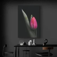 Ce Tableau Tulipe Rouge montre une tulipe rouge en gros plan, avec des pétales charnus et un coeur sombre. On voit la tige verte qui descend, une courbe nette, et un jeu de lumière qui souligne la texture des pétales. Le fond reste sobre et uni, ce qui met la fleur au premier plan, simple et clair.