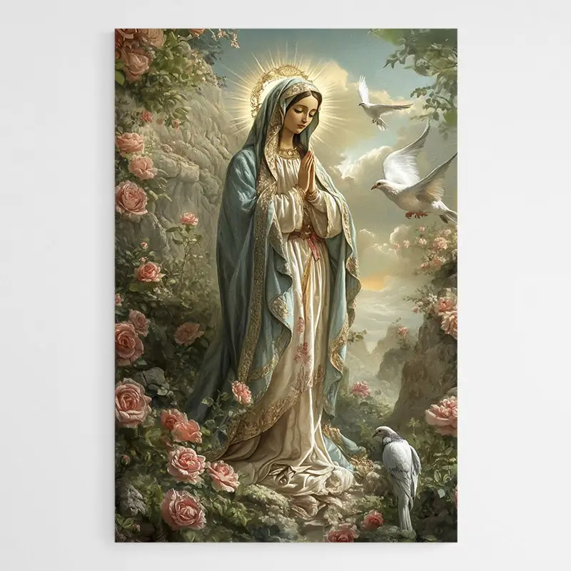 La composition mise sur la simplicité: lignes nettes, surface lisse, peu d'ornement. Cela plaît à qui cherche une œuvre sacrée mais contemporaine, pour une entrée, une chambre ou un coin de prière. On ressent une atmosphère recueillie et intime, plutôt méditative. Il conviendra aux amateurs d'iconographie religieuse moderne et à qui cherche une présence apaisante au mur.