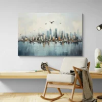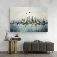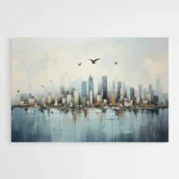Ce Tableau Ville Moderne montre une silhouette de ville moderne, avec des immeubles aux façades géométriques, des fenêtres rectangulaires et un ciel en dégradé clair. On voit des lignes verticales marquées, des toits plats et quelques points de lumière qui signalent des fenêtres allumées. L'image reste minimaliste, lumineuse et structurée. On sent tout de suite une atmosphère calme et contemporaine.