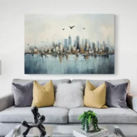 On accroche cette toile au-dessus d'un canapé ou dans un bureau, sur un mur clair pour que les formes ressortent. On complète avec objets en métal noir ou bois clair, ou avec d'autres affiches urbaines pour une série. Découvrez aussi nos tableaux ville et tableaux moderne.