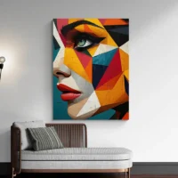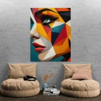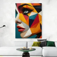 Ce Tableau visage femme fleurs rouges montre un visage féminin stylisé, traité par plans géométriques et aplats de couleurs. On voit des zones de couleurs qui suivent les contours, des lignes noires qui structurent le visage, et des fleurs rouges posées près de la tête. Le nez se dessine en formes angulaires, la bouche apparait rouge, le regard paraît décalé entre face et profil, ce qui crée du mouvement. On a l’impression d’un portrait moderne, vif et construit.