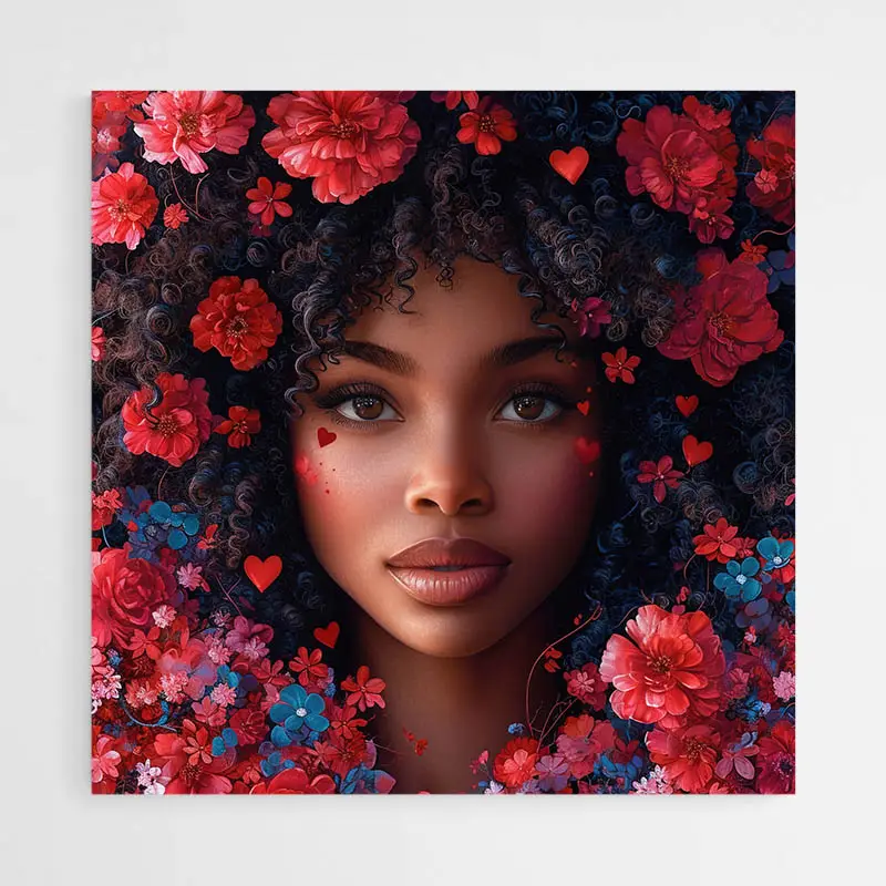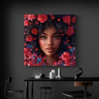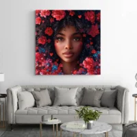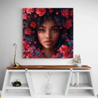 Le rendu transmet calme et intensité à la fois. Les fleurs rouges apportent chaleur. Le visage, posé au centre, donne une sensation de présence. Ce tableau convient aux amateurs de portraits féminins, à ceux qui cherchent une pièce au style contemporain et volontaire, et même à ceux qui aiment les touches florales fortes.